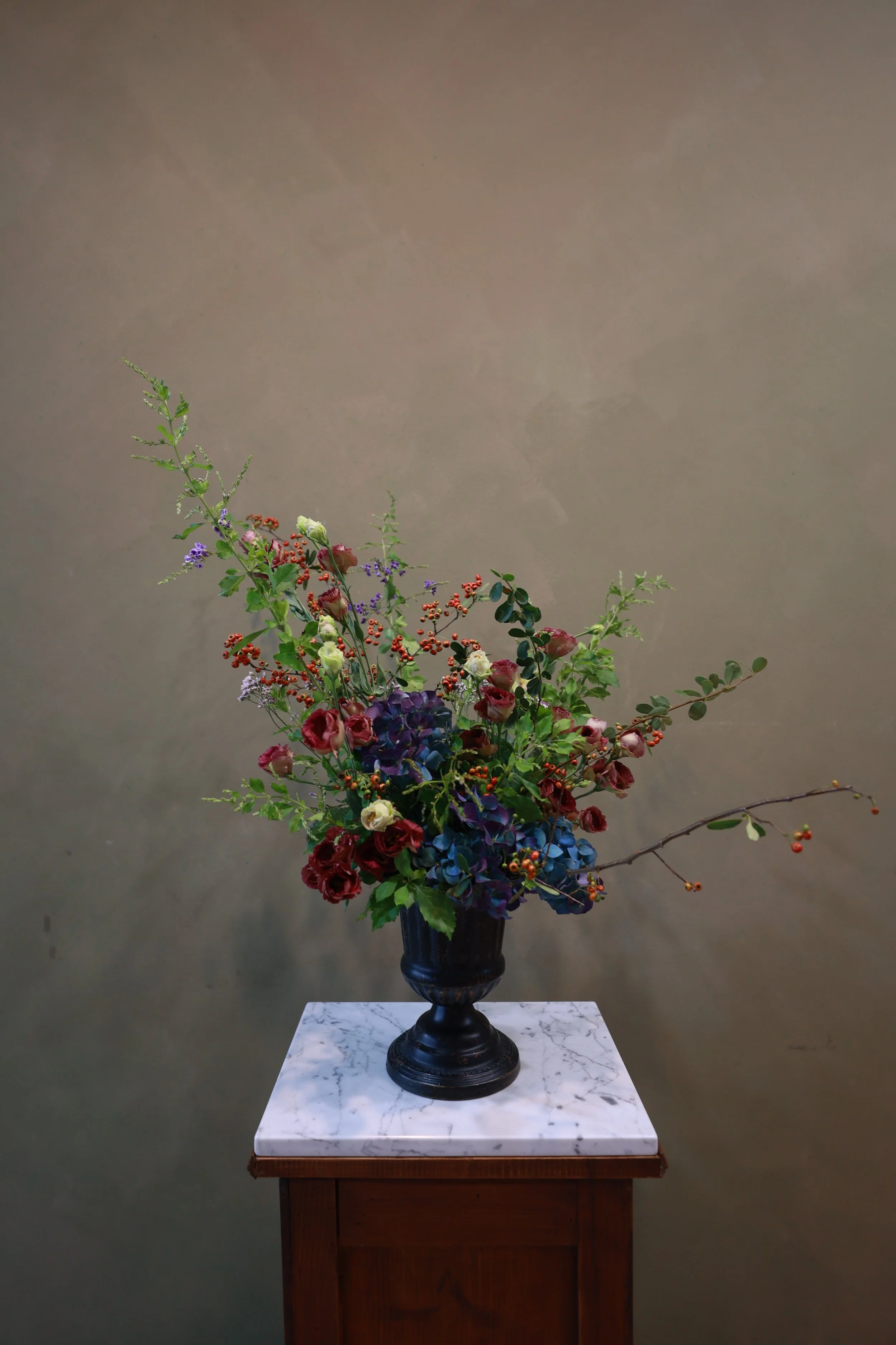 材料|琥珀紅桔梗、荷蘭古典藍繡球、山蘋果、金露草、進口粉水晶花