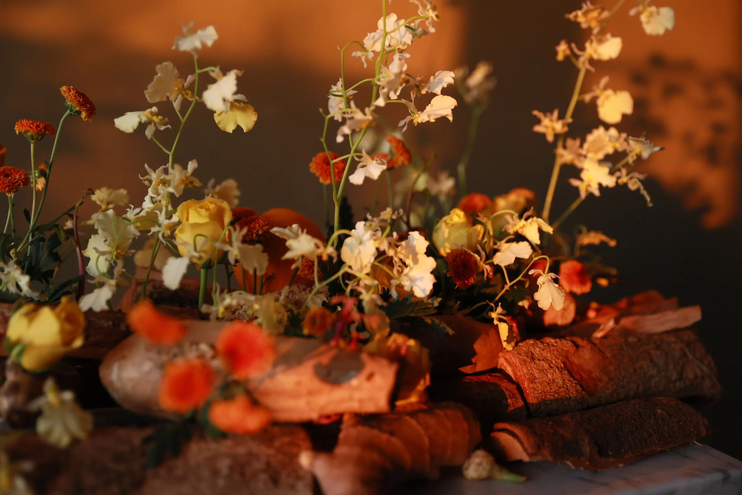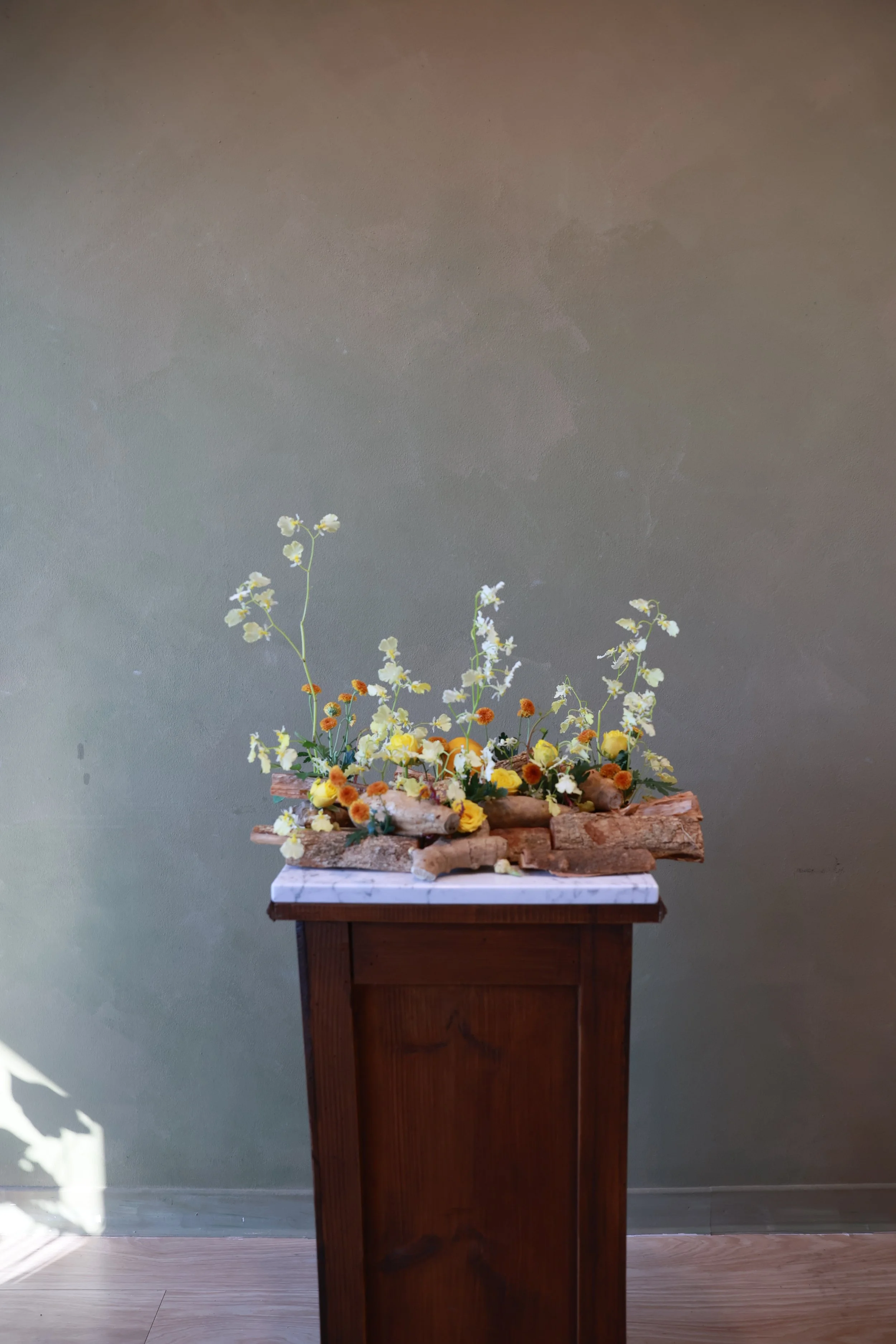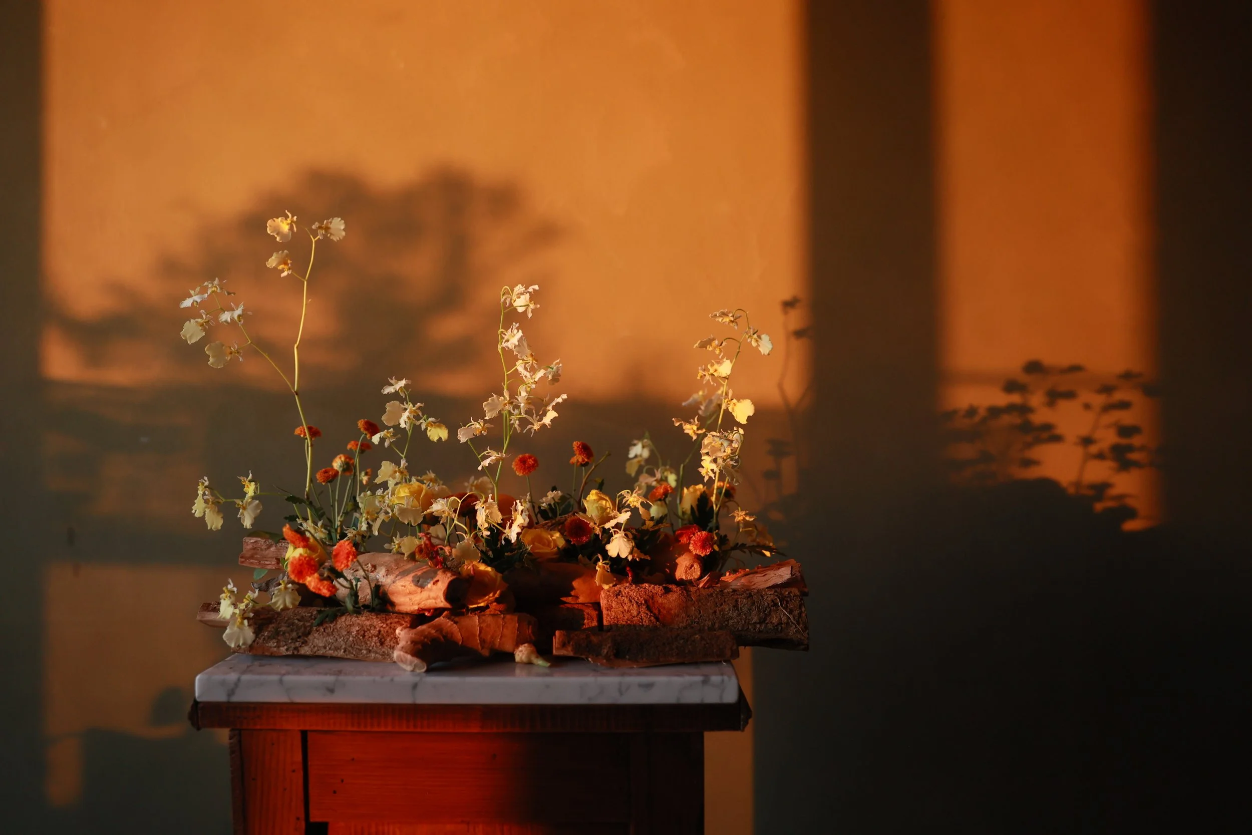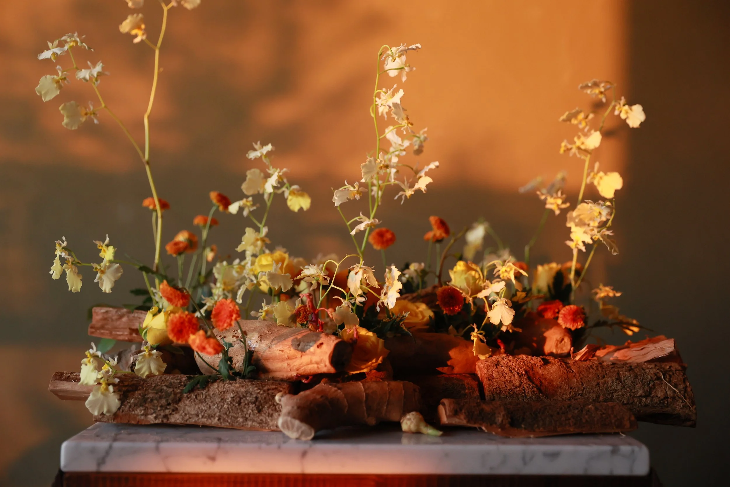 材料|月光文心蘭、越南法小菊、鑽石黃玫瑰、橘子、地瓜、木片、木材