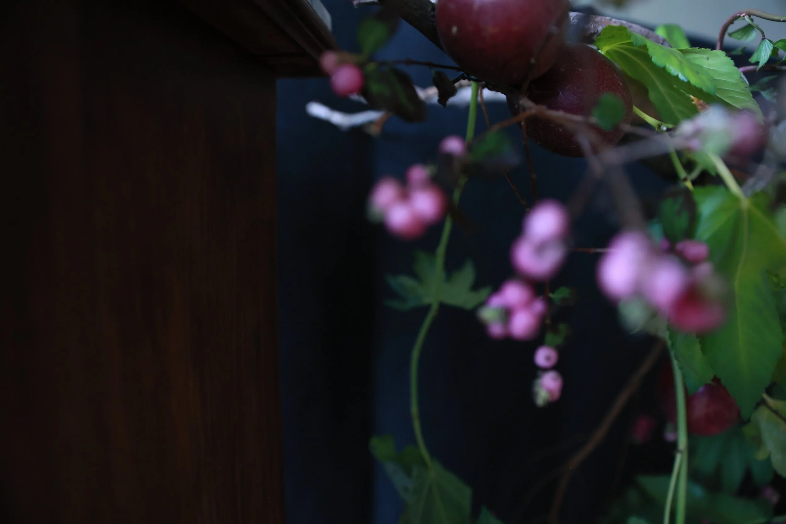 時序入秋,各種元素開始自四方匯集:拾起公園裡掉落的殘枝,意外發現生動的枝條曲線;行經去年發現欒樹果的路段,驚喜注意到地面又鋪蓋了一片橙黃秋意,其中還有一些乾燥的綠,來不及成熟前已先被吹落…於是這段小綠果也加入作品風景;家中那一箱百香果,是在中秋後自埔里結出的香甜果實,深、棕紅的色調取代了華麗的鮮花成為代表秋季豐收的主角;最後是近秋才會在花市裡看到的粉紅雪果(毛核木/小蘋果),在他的葉子變色、枯萎、飄落後,卻留下了這樣粉嫩討喜的小秋果,令整個作品為之一亮。□