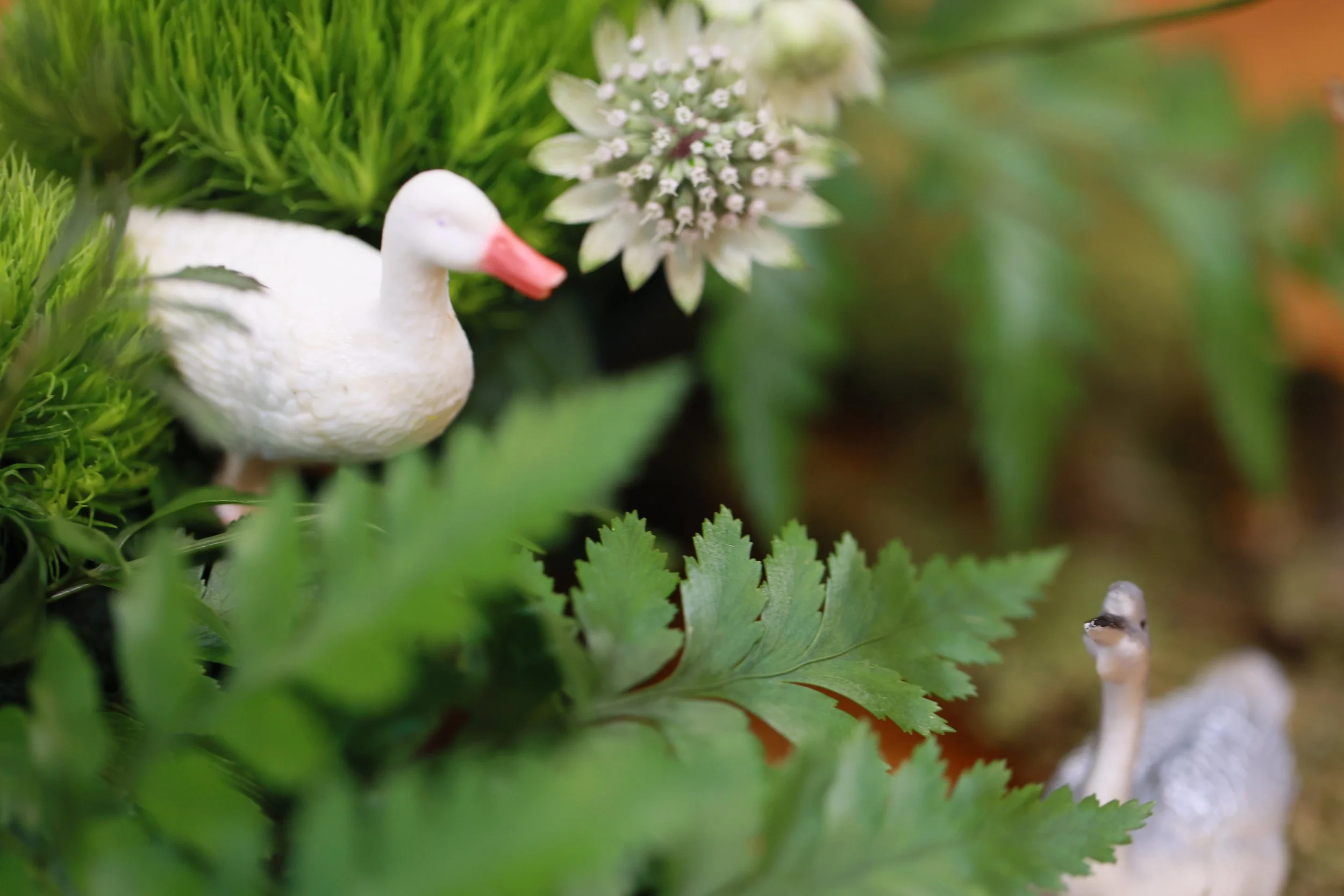 再往湖邊看,一對天鵝和鴨靜靜滑行在如鏡湖面,組合奇異卻又有股不違和的平靜感,為這夢境般的景象增添一股幻奇的氛圍...