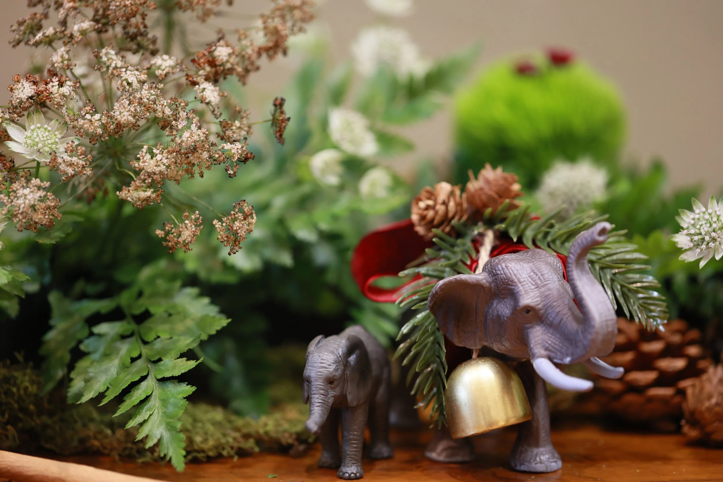 不遠處,一隻巨大的大象慢悠悠地靠近,頸部掛著節日歡慶的吊飾,準備為一場冬日動物狂歡節展開序幕。身旁緊隨著一隻小象,動作顯得有些笨拙,卻充滿童趣。牠不時發出短促的吼聲,像在宣告自己的存在。