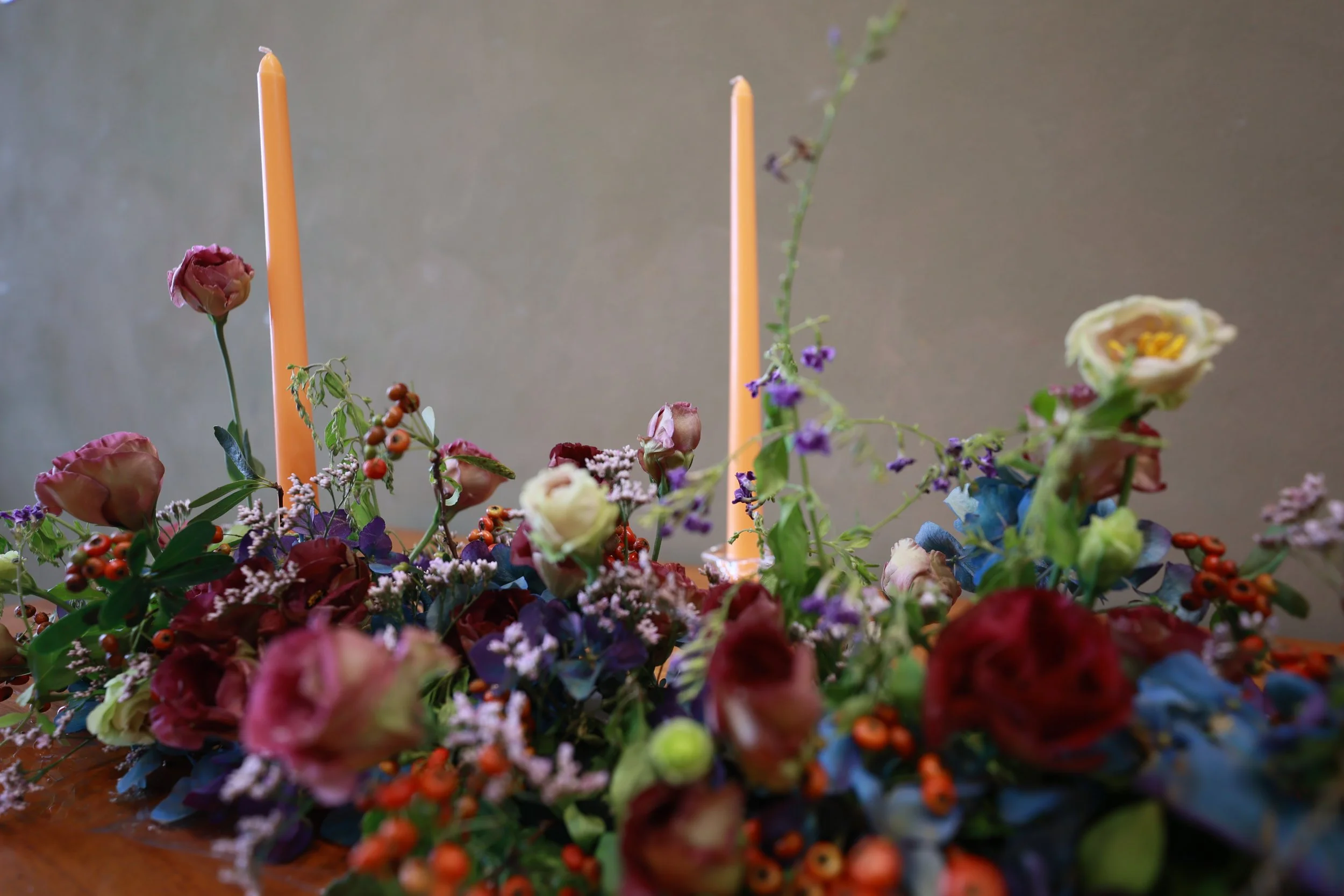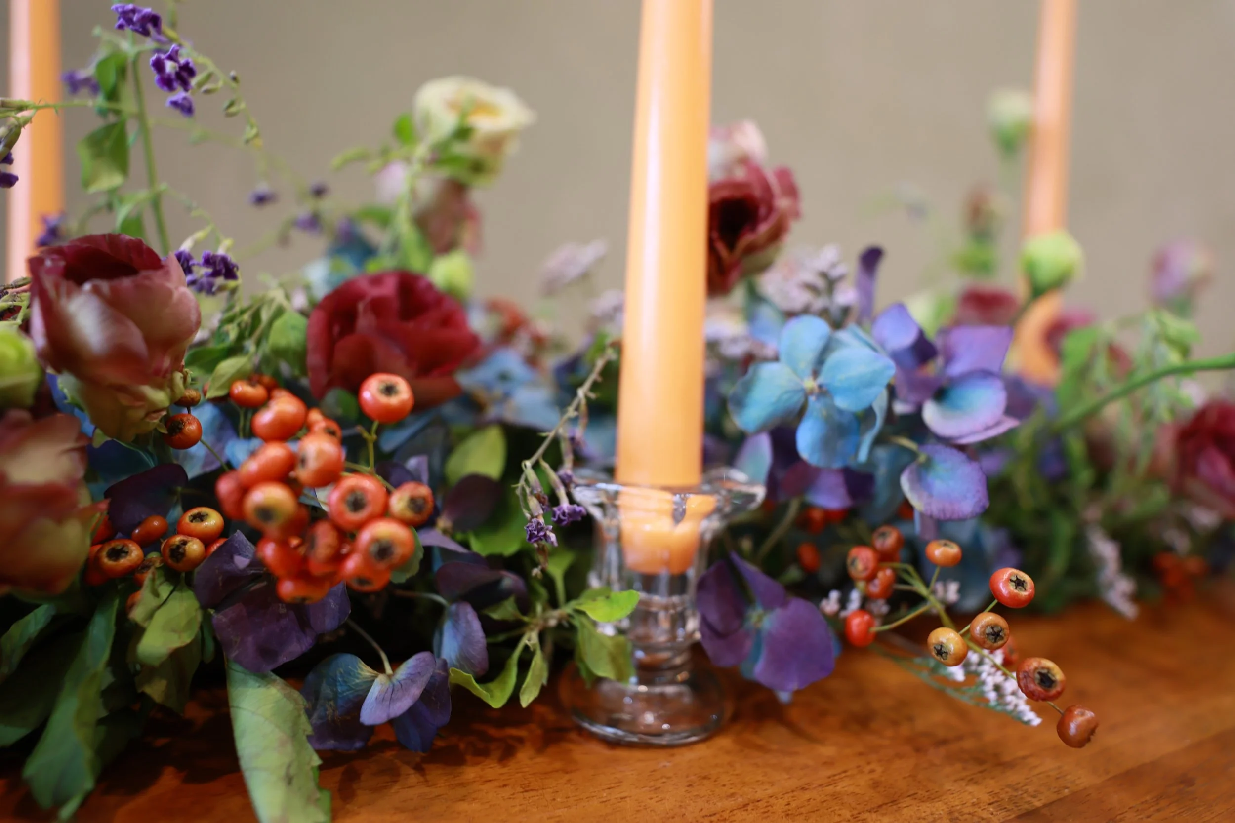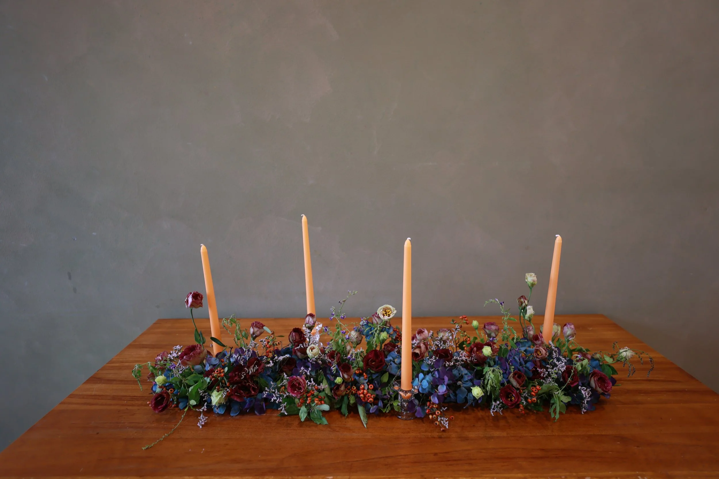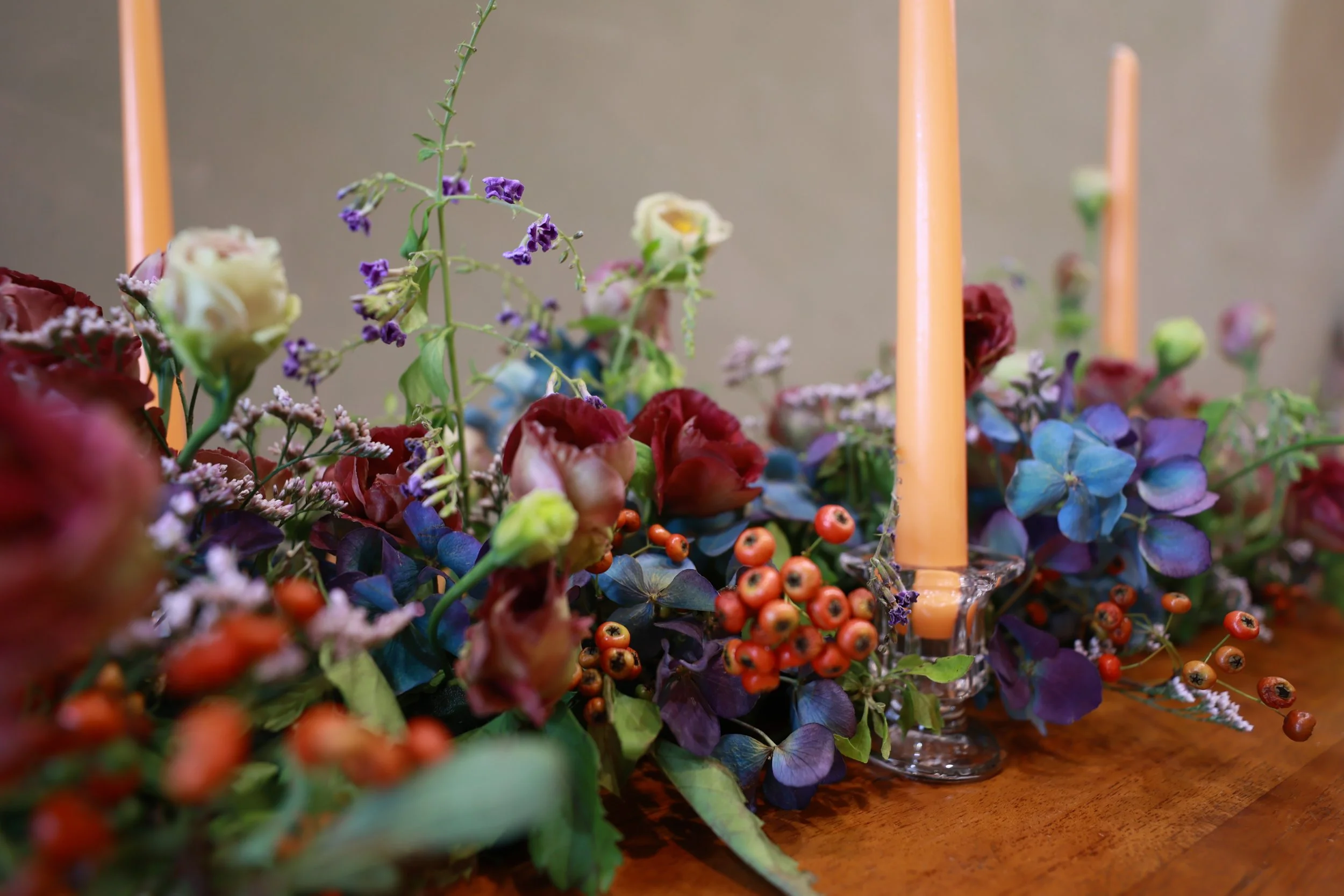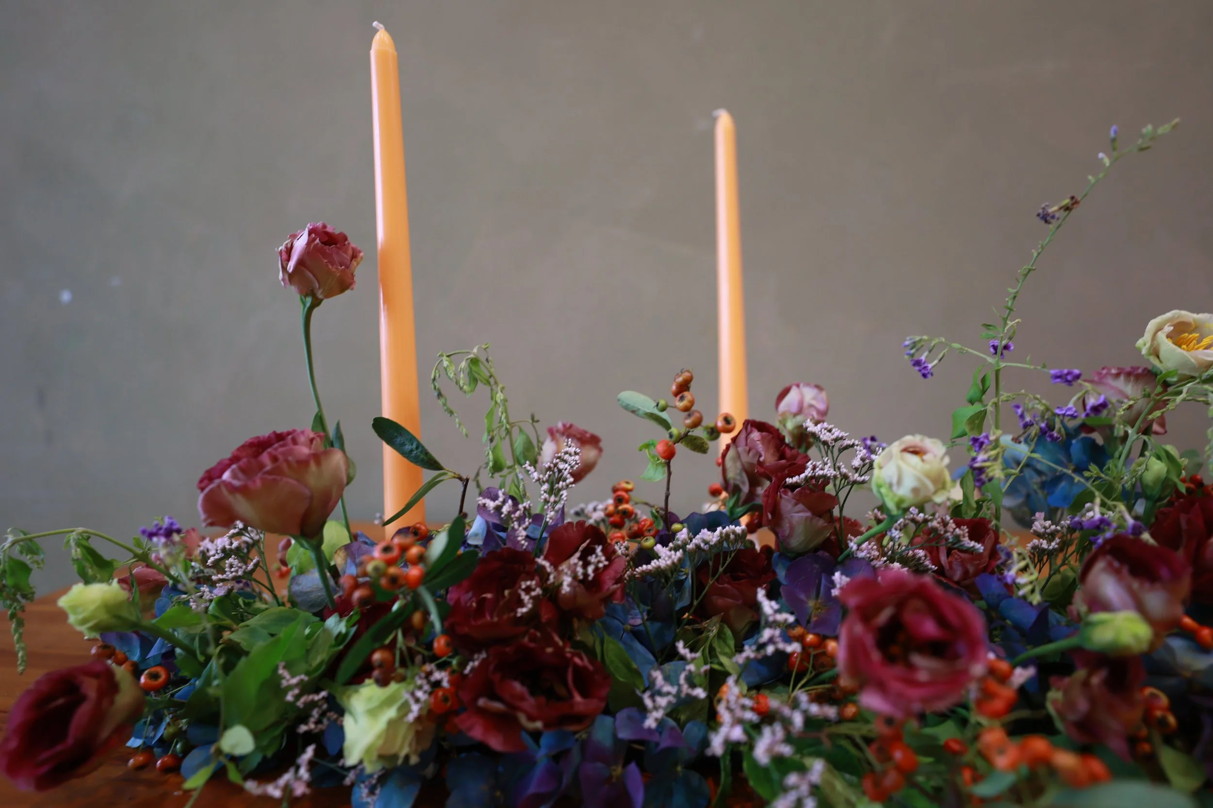 餐桌花作品重現羅馬花園內諸神各顯神技的奧秘古典氛圍,以飽和度高的濃重色調呈現整體視覺。綴以些許小花,躍動在繁茂的花叢中。燭火用以提高明度,在燭光熠熠下感受古典花園、端詳食物原貌。□